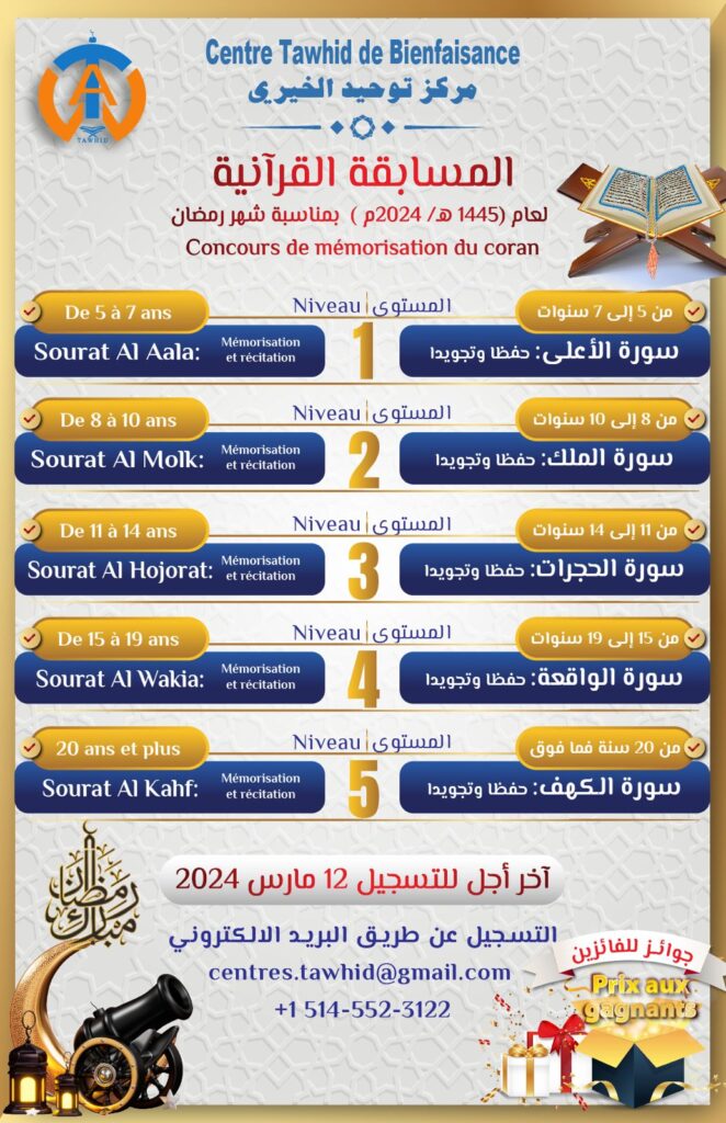 Le Centre de Bienfaisance Atawhid est ravi d’annoncer son tout premier Concours de Mémorisation du Coran, en l’honneur du mois sacré du Ramadan. Cet événement exceptionnel offre une opportunité unique à la communauté de se réunir dans un esprit de dévotion et de compétition fraternelle.